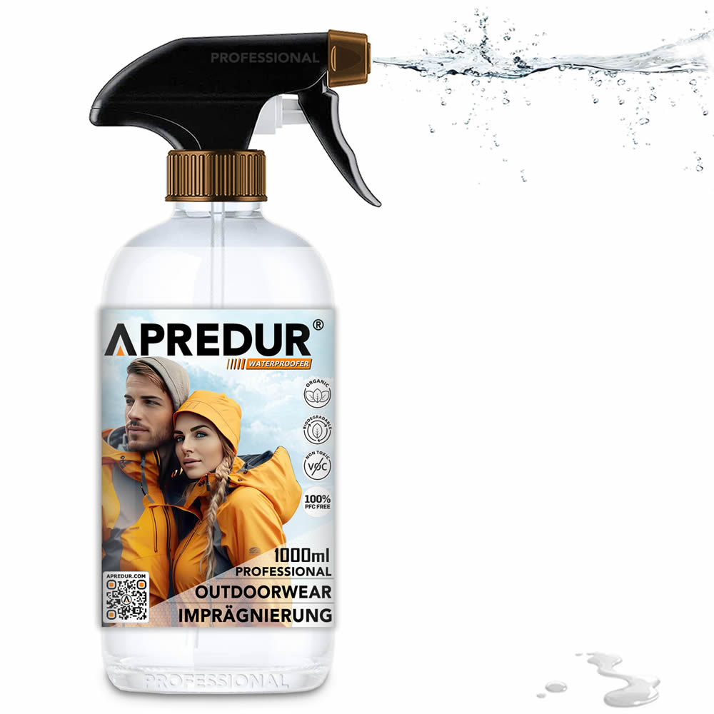 APREDUR OUTDOORWEAR Waterproofer: Die Outdoor-Imprägnierung erzeugt einen effektiven, unsichtbaren Schutz auf den Textilfasern, der das Anhaften von Schmutz, Öl und verschiedenen Flüssigkeiten wie Wasser, Kaffee und Wein verhindert.