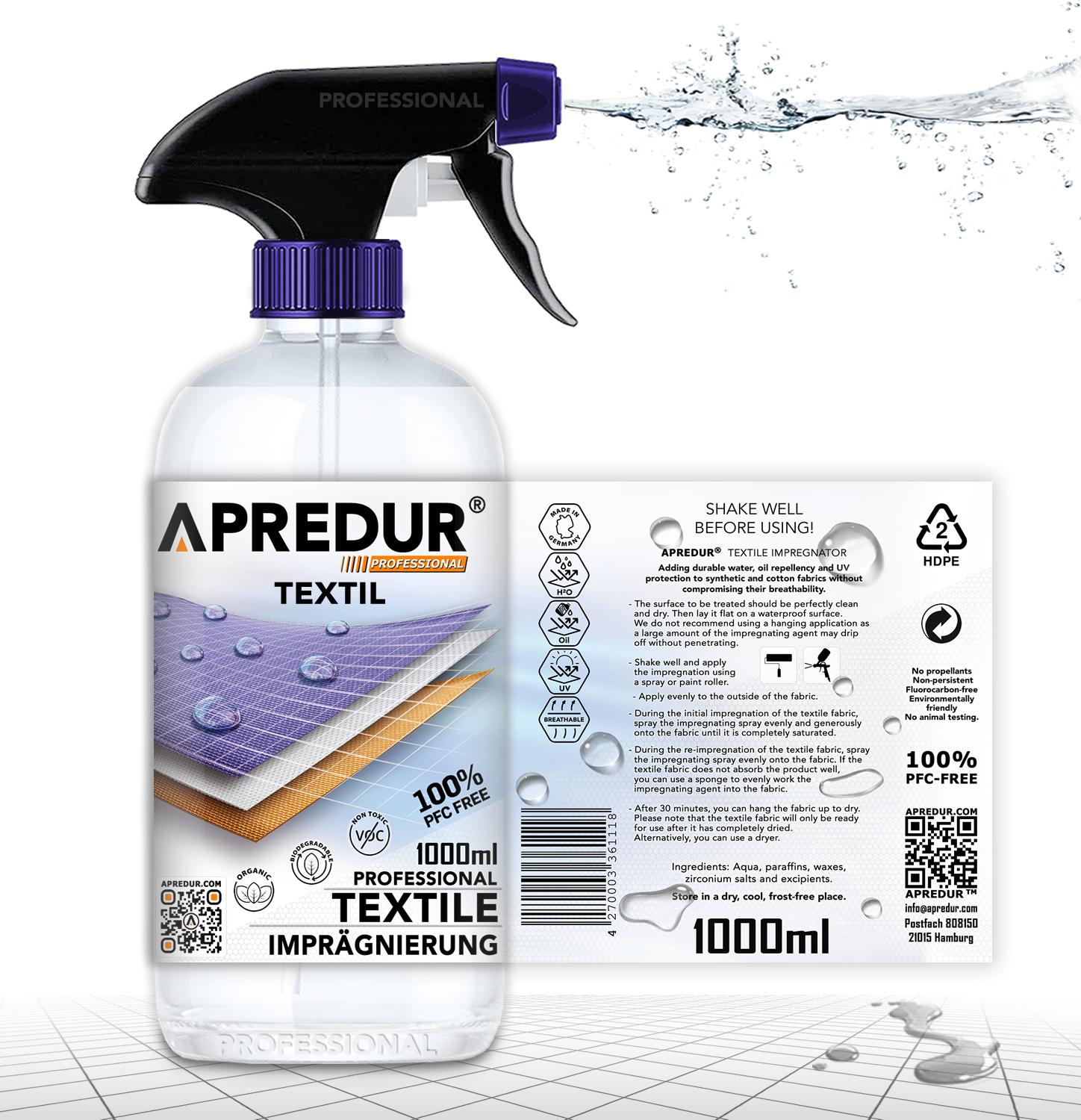 APREDUR PROFESSIONAL Waterproofer: Die Professional-Imprägnierung ist speziell für den gewerblichen Einsatz geeignet und findet Anwendung in Wäschereien, Wohnwagenaufbereitern, Textilherstellern, Markisenherstellern und anderen Branchen. Sie bietet einen effektiven, unsichtbaren Schutz auf den Textilfasern und verhindert das Anhaften von Schmutz, Öl und verschiedenen Flüssigkeiten wie Wasser, Kaffee und Wein.